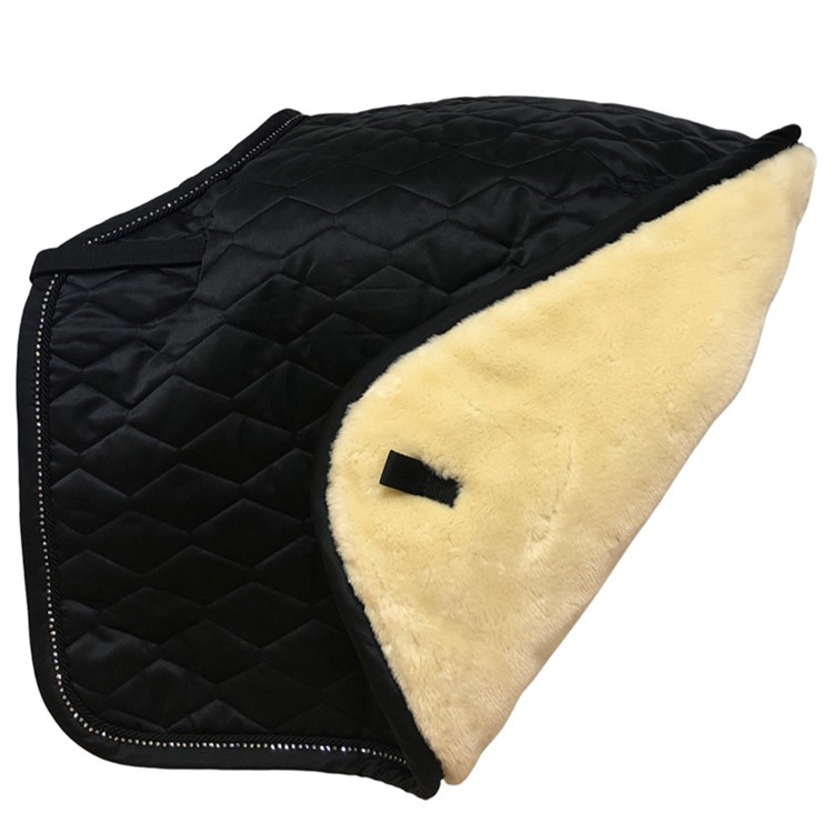 Elegant ländtäcke i svart blankt tyg med glittrande kristallpasspoal. Mysigt innerfoder av tjockt syntetfårskinn.